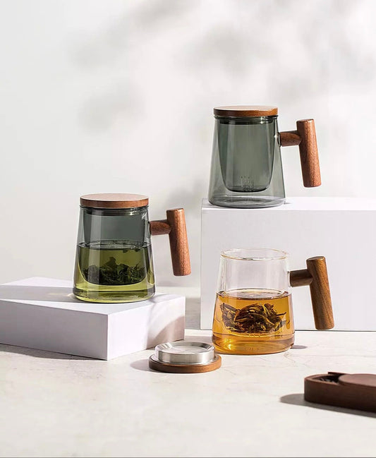 Green Glass Coffee Mug, Glass Coffee Cup, Clear Glass Coffee Mug, Double Wall Glass Mug, Wood Handle, Borosilicate Glass, Gifts, 430ml