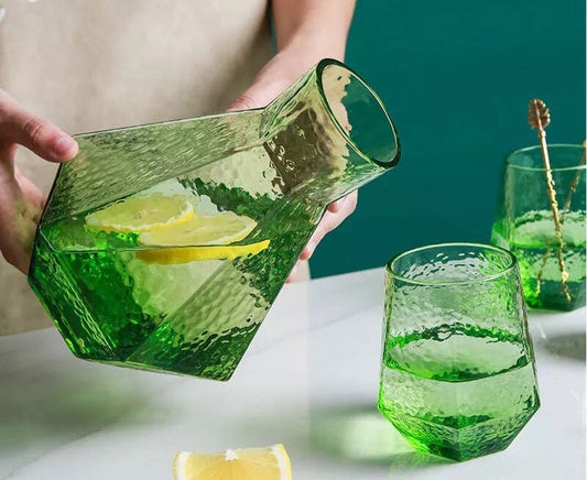 Green Geometric Carafe Set, Glass Decanter, Diamond Glasses, Green Glass Pitcher, Carafe Tray, Ball Cork Stopper, Carafe & Glass Set, Gift Set