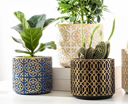 Planter Pot with Drainage | Damask Succulent Pot | Plant Pots | Large Indoor Planter | Drainage Tray | Blue | Gold | White | 6 inch