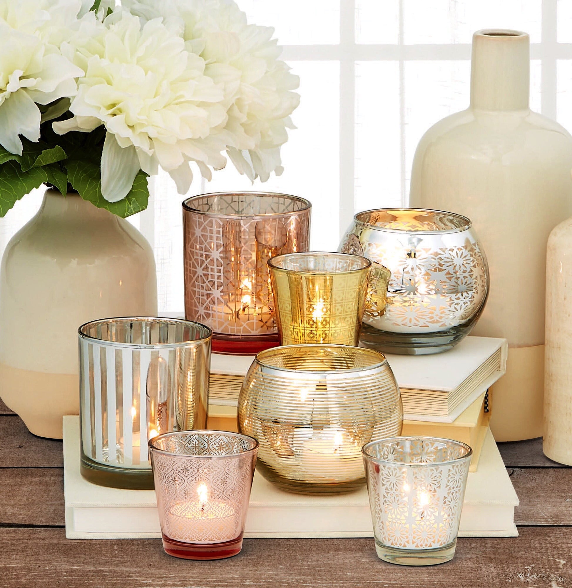 Gold Candle Holders, Glass Candle Holders, Votive Candle Holder Set, Tea Light Holder, Luminous, Set of 3, 3” D